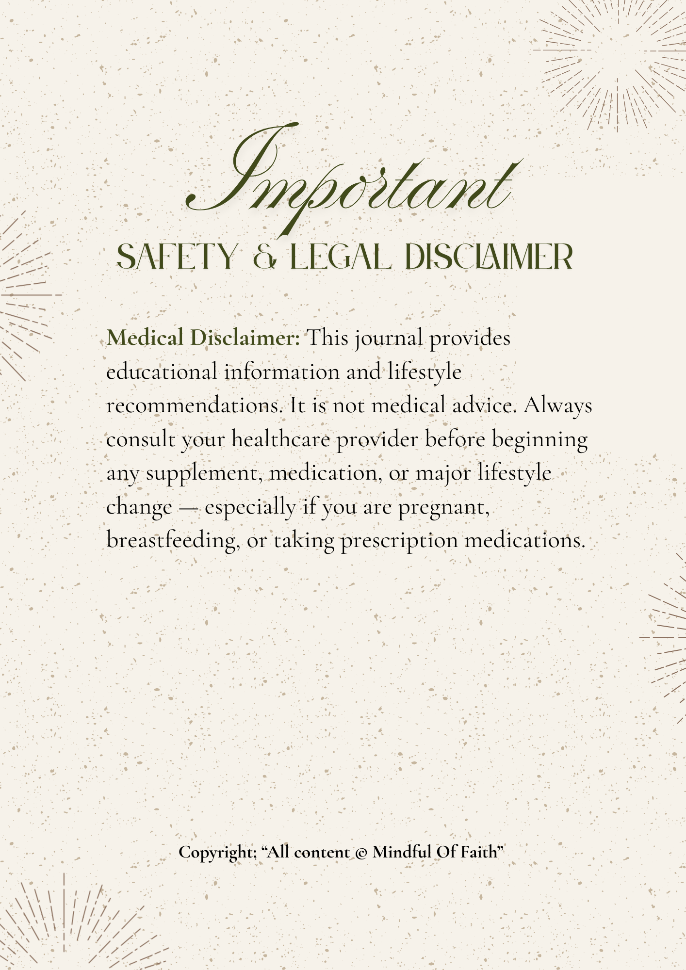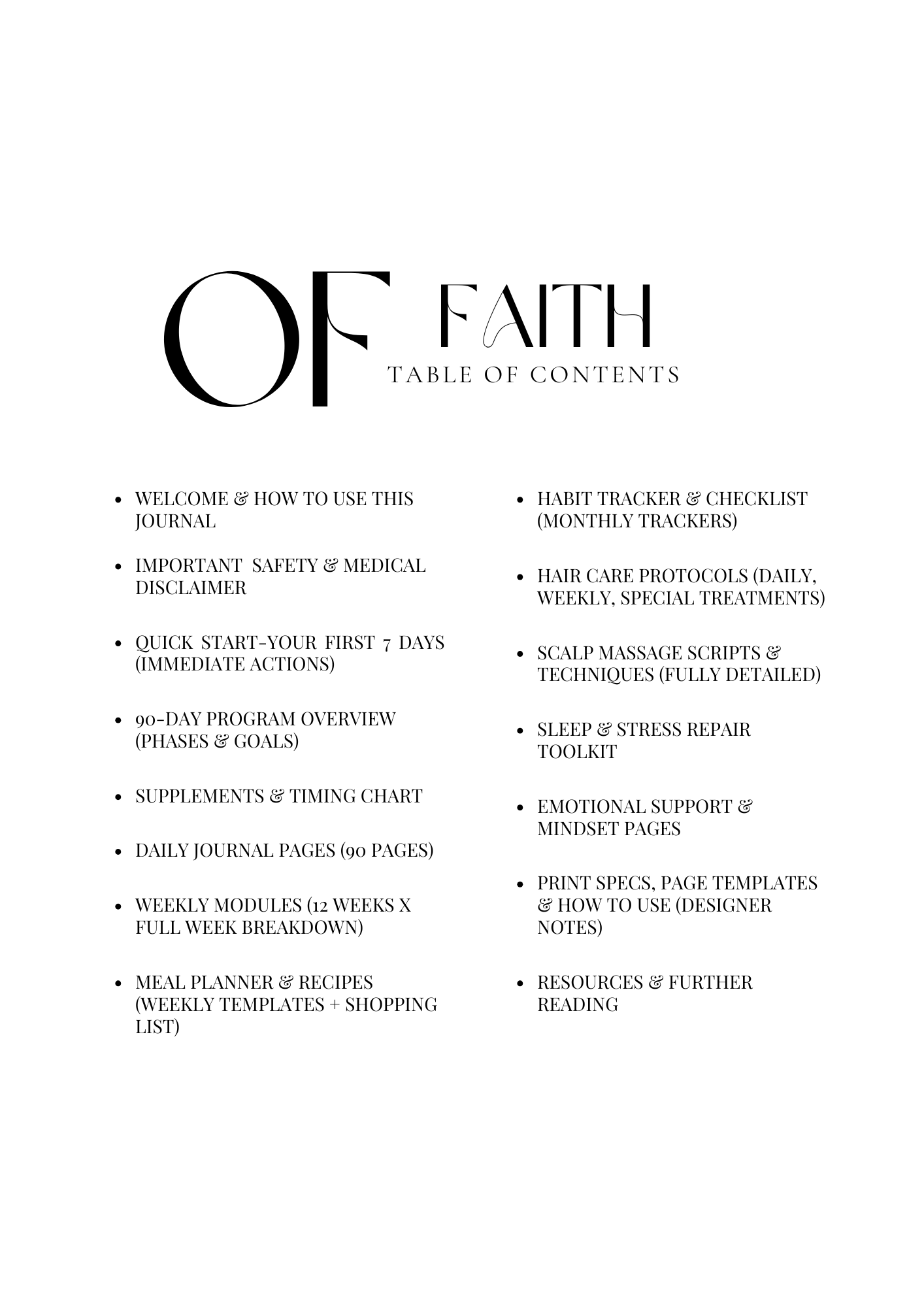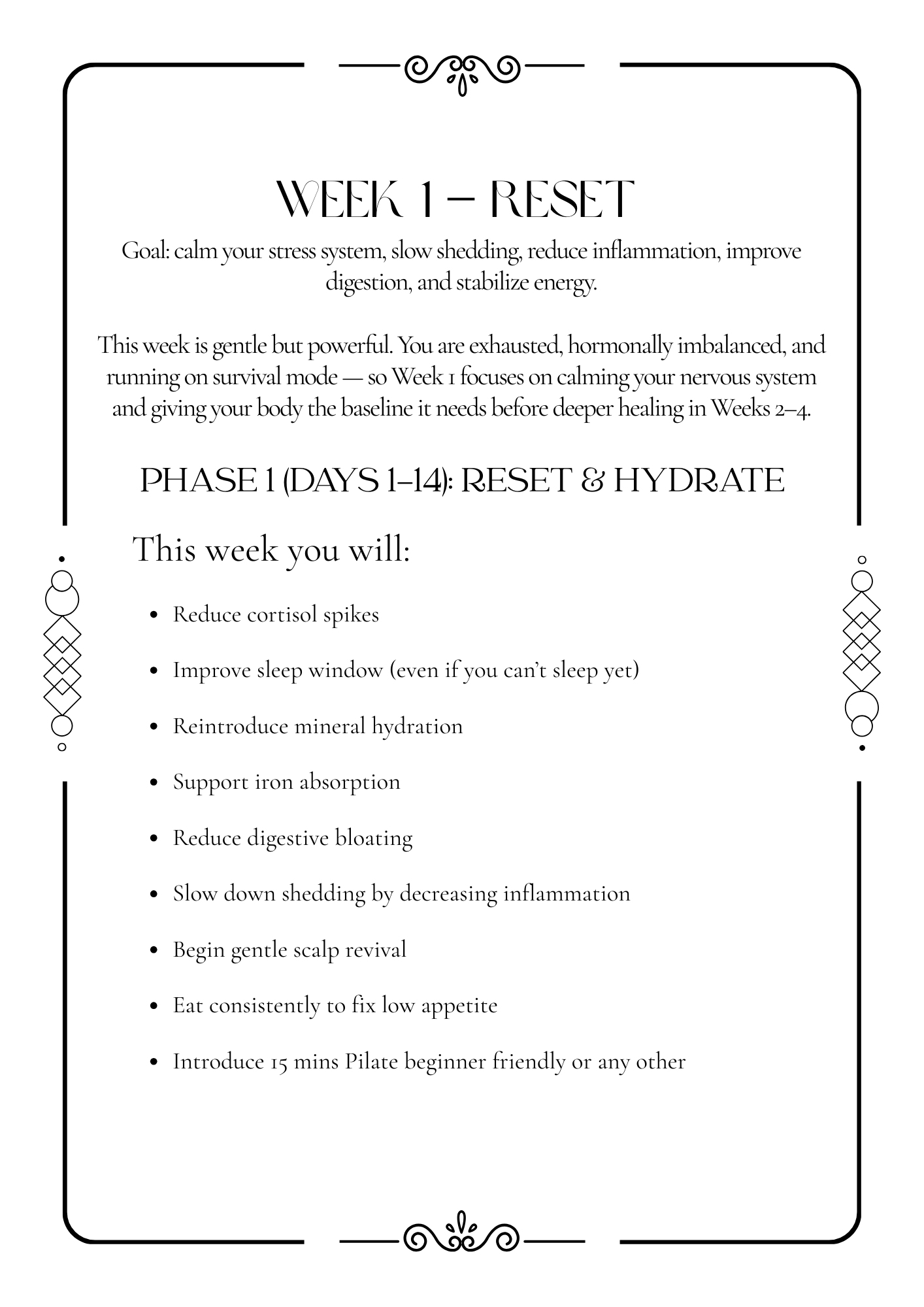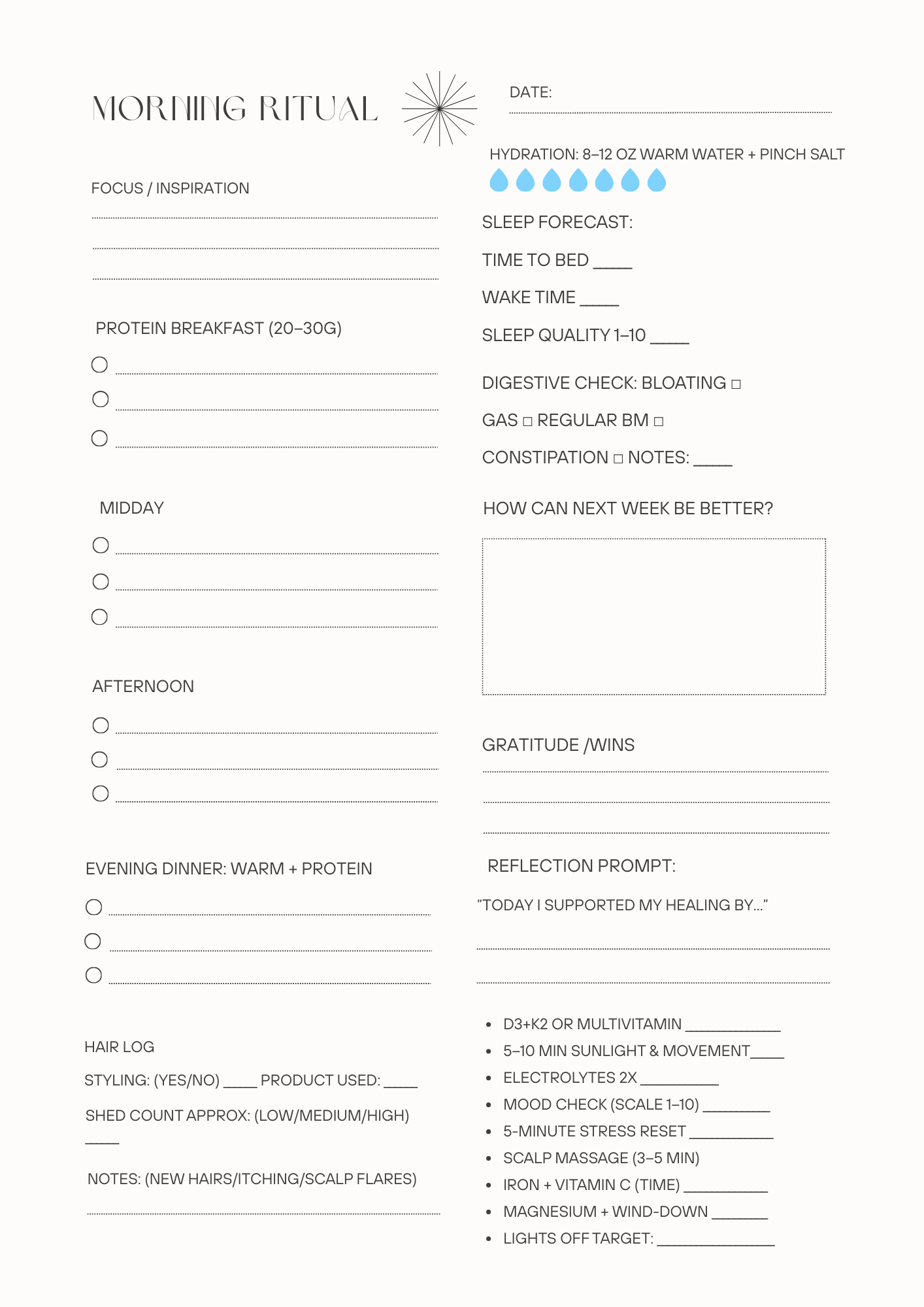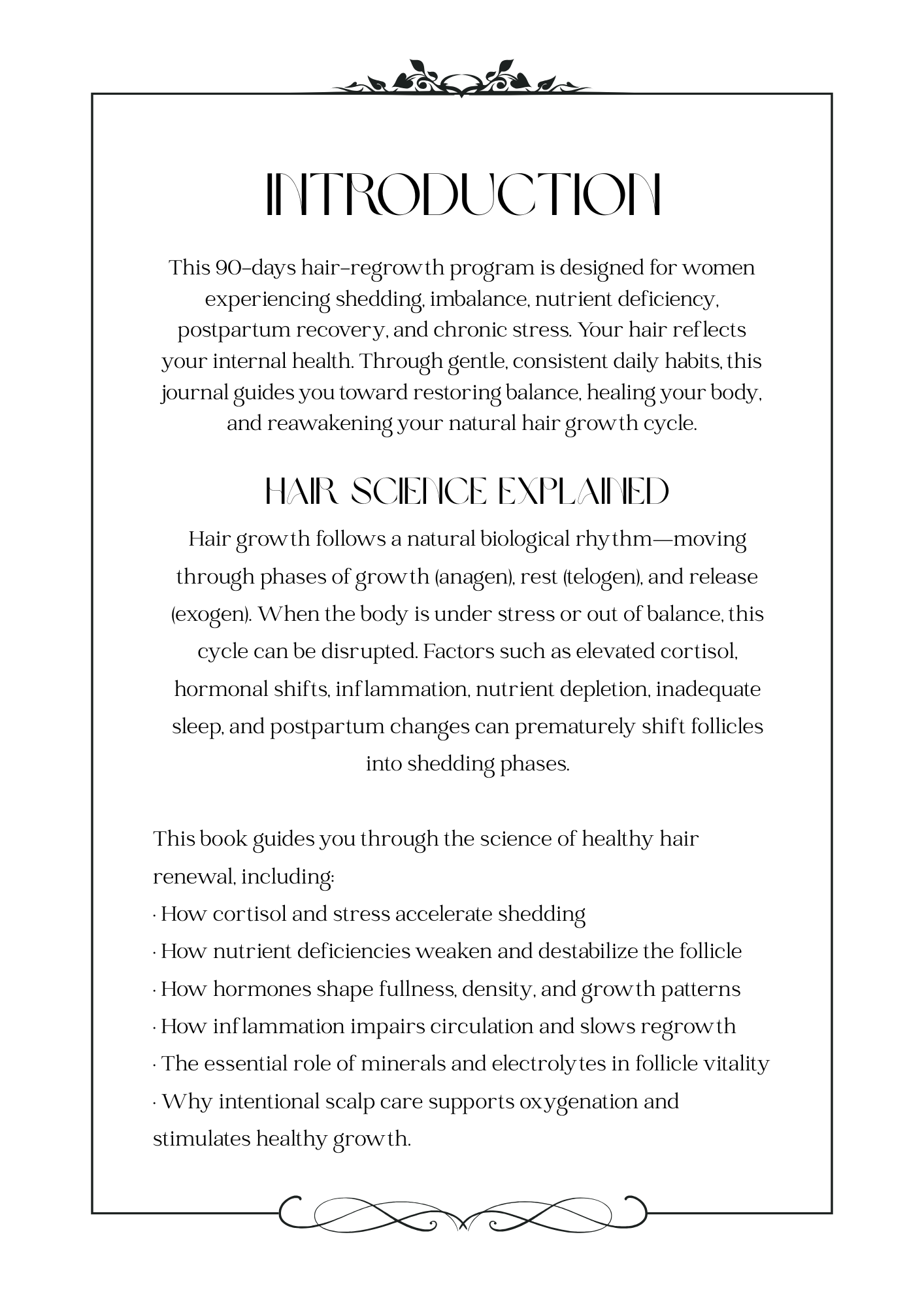 This Journal was crafted with care for women who’ve experienced the exhaustion, confusion, and heartbreak of hair loss. Over the next 90 days you’ll follow a gentle, science-informed, and mother-friendly program to restore energy, rebalance hormones, repair nutrient gaps, and reactivate your hair’s growth cycle. Move at your pace; consistency over intensity is your greatest ally.